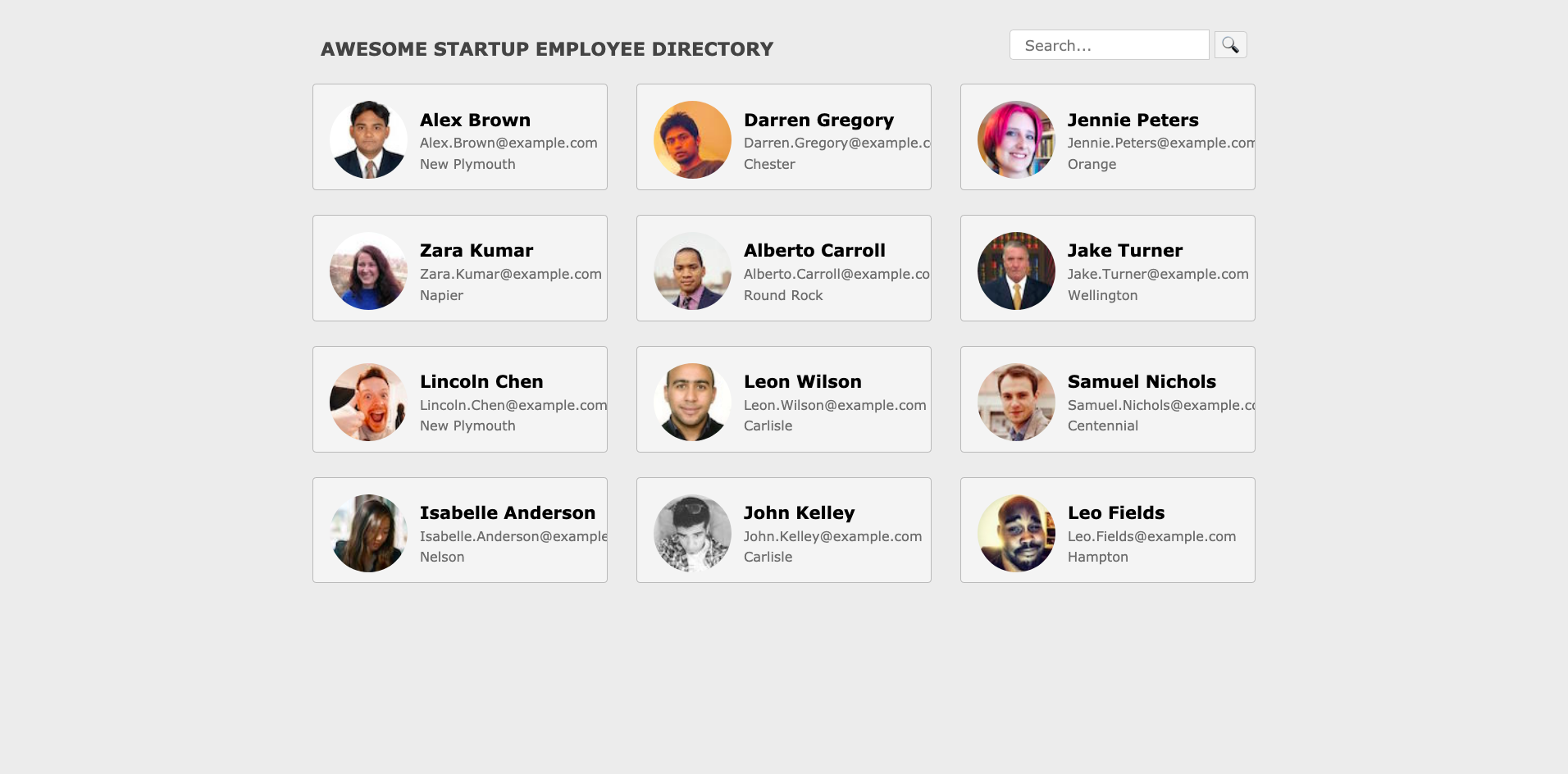 The employee directory of a fictional company that consists of employees generated from Random User Generator. There is also a search functionality.