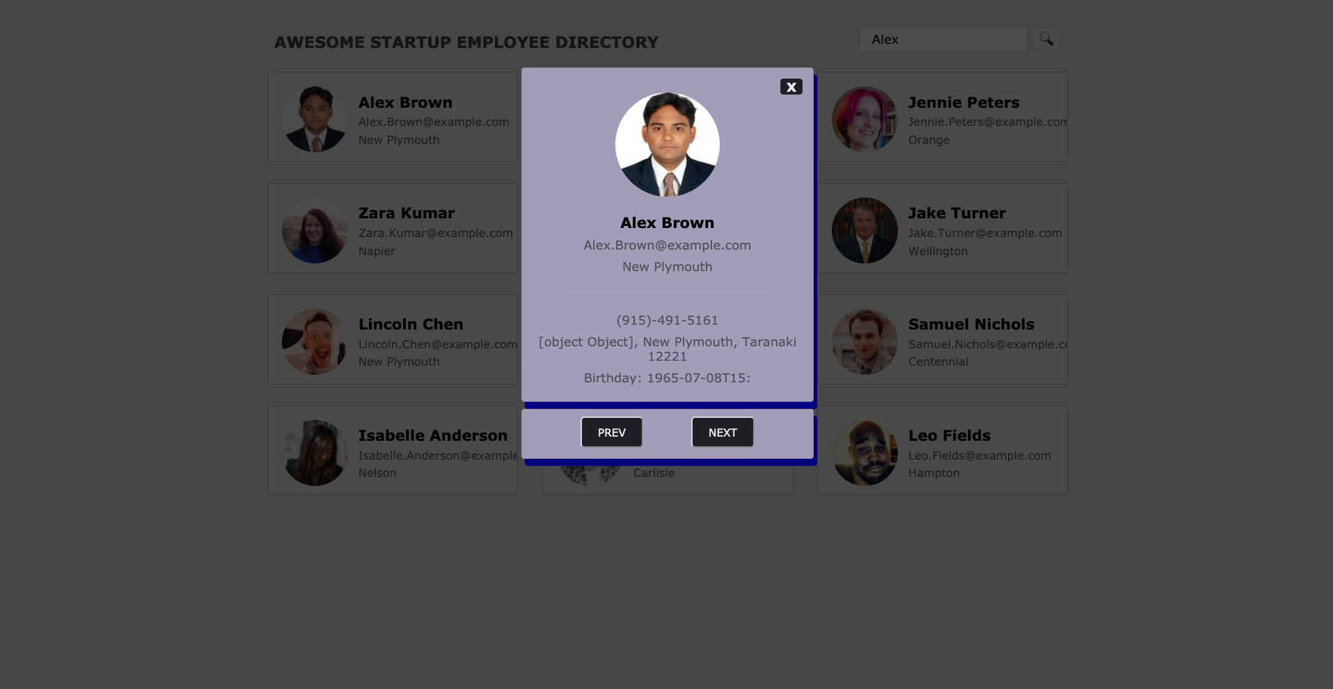 Learn More →The employee directory of a fictional company that consists of employees generated from Random User Generator. There is also a search functionality.